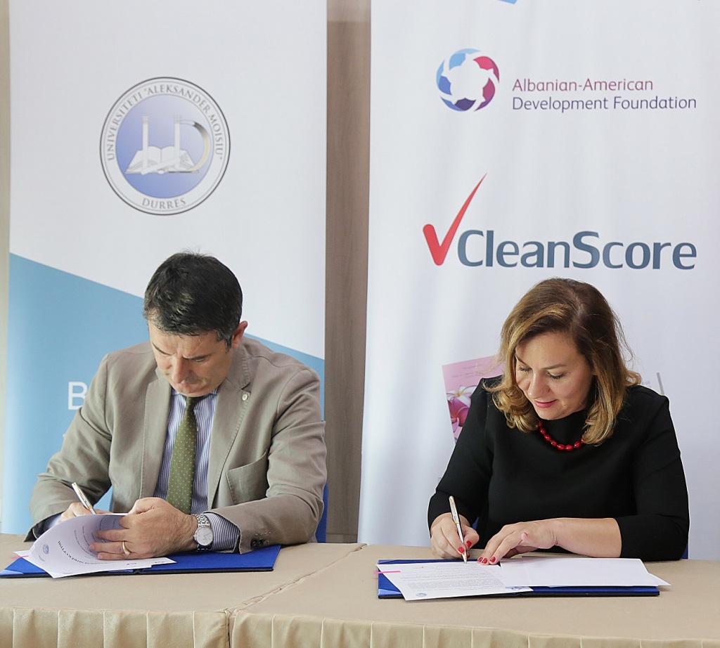 Në kuadër të Projektit CleanScore, u nënshkrua Memorandumi i Mirëkuptimit ndërmjet Fondacionit Shqiptaro-Amerikan për Zhvillim (AADF), përfaqësuar nga Bashkë-Drejtorët Ekzekutive Z. Aleksandër Sarapuli dhe Z. Martin Mata dhe Universitetit “Aleksandër Moisiu”, Durrës, përfaqësuar nga Rektori i Universitetit Prof. Dr. Kseanela Sotirofski. Ky Memorandum ka si qëllim të implementojë korrigjimin e automatizuar të provimeve, duke ndihmuar në rritjen e transparencës dhe cilësisë në vlerësimin e studentëve, po ashtu dhe përmirësimin e cilësisë së mësimdhënies duke zëvendësuar tekstet aktuale me versione ndërkombëtare. Projekti financohet tërësisht nga AADF me një vlerë $400,000 dhe po pilotohet në universitete publike dhe private, ku janë testuar nëpërmjet CleanScore mbi 20,000 studentë në 50 lëndë të ndryshme. AADF po punon për përkthimin në shqip të katër librave ndërkombëtarë të fushës së ekonomisë të cilat do të jenë në të ardhmen në dispozicion të studenteve duke garantuar tekste cilësore dhe bashkëkohore.